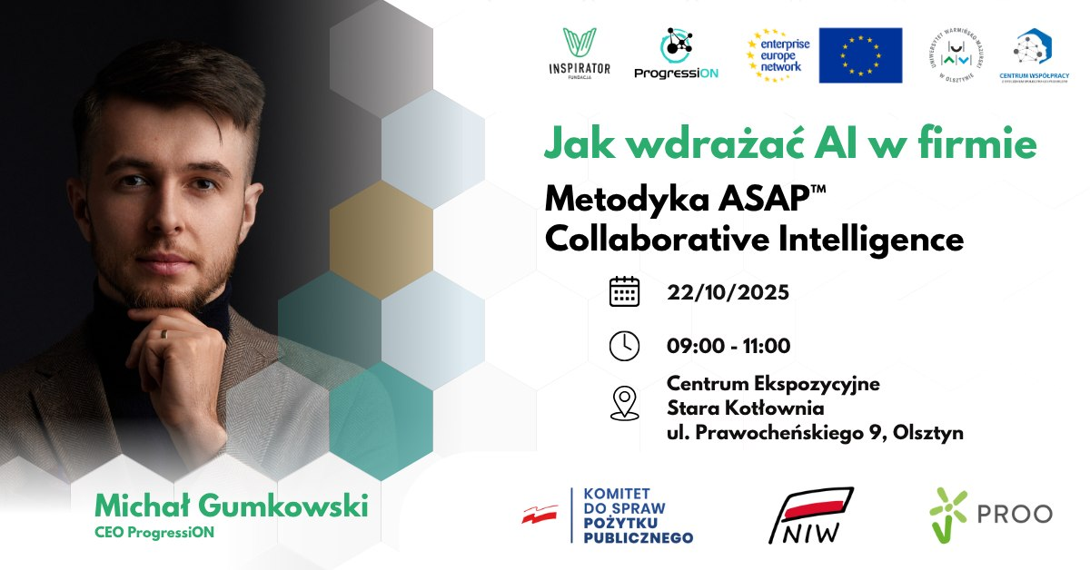Na te pytania odpowiemy podczas spotkania “Jak wdrażać AI w firmie. Metodyka ASAP™ Collaborative Intelligence” – praktycznego wydarzenia skierowanego do firm sektora MŚP, liderów, menedżerów i osób odpowiedzialnych za rozwój oraz innowacje.